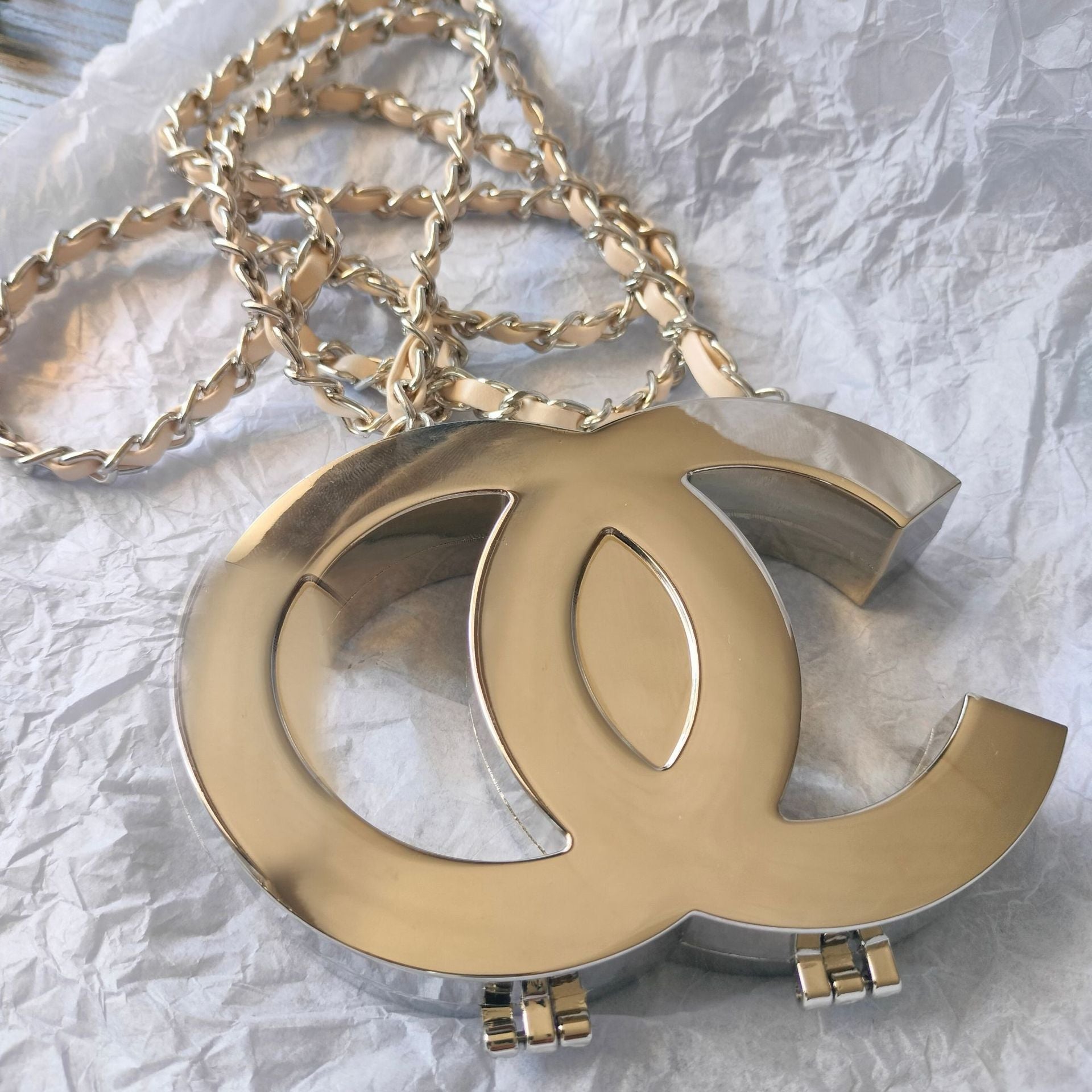 Interlocking double-C pendant in polished metallic finish. A statement piece that exudes timeless luxury, crafted with a sturdy chain and secure clasp for comfortable wear. Perfect for elevating evening outfits or adding a chic touch to everyday looks.